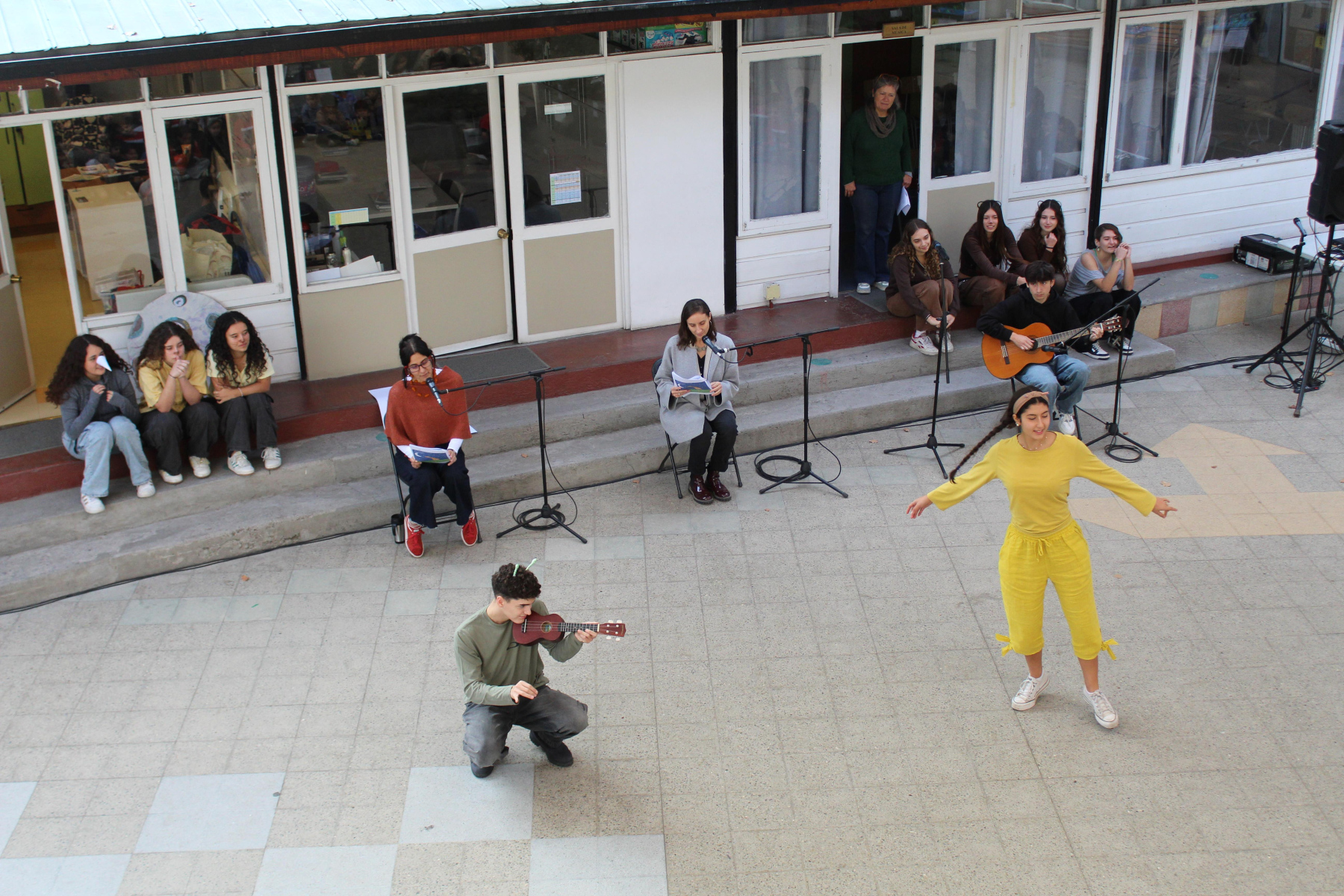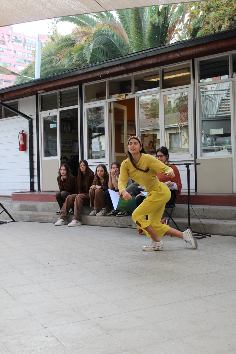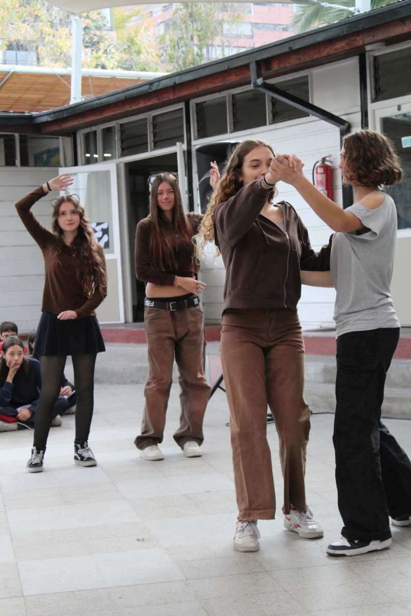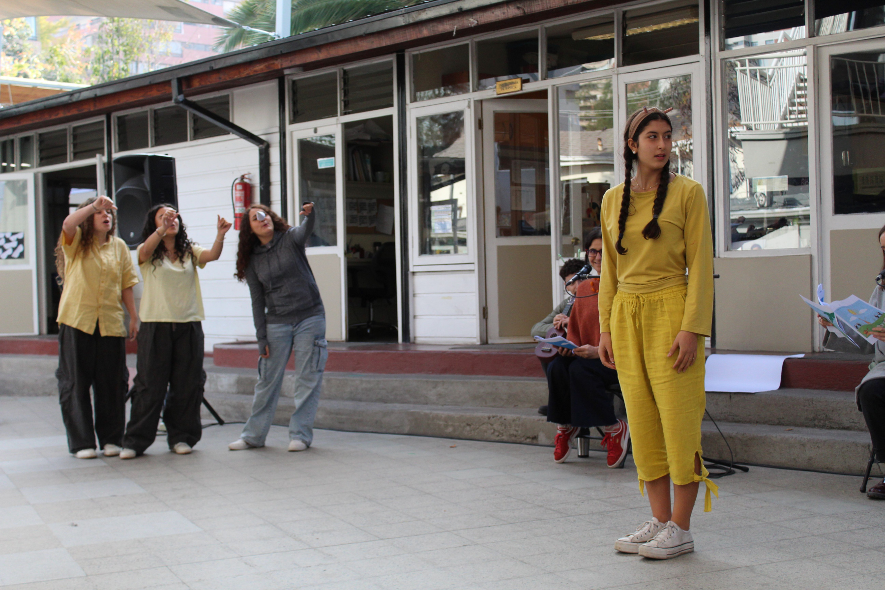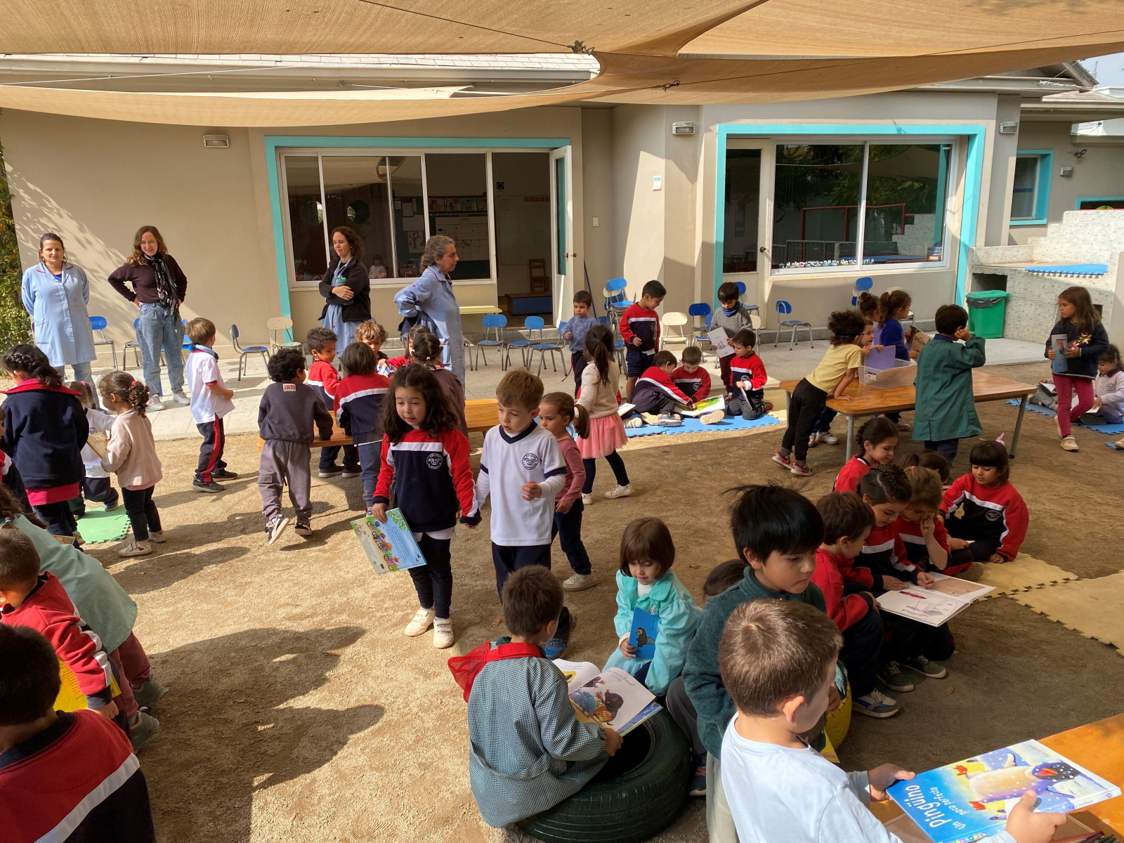 El jueves 24 de abril continuó la celebración en el patio de la campana con nuestra Directora, Mme. Bárbara Albagly y Mme. Mónica Sadá quienes narraron el cuento “La jirafa no puede bailar” de Giles Andreas a los cursos de 1° a 6° Básico los cuales escucharon atentamente. La narración fue acompañada por los estudiantes de 4º Medio: Dominga Erazo, Renata Mahnke, Josefa Díaz, Simona Vera, Amelia Corvalán, Elisa Montes, Carmen Santa-Cruz, Manuel Oyarzún, Ágata Jordan y Arturo Rivera quienes representaron teatralmente el cuento.