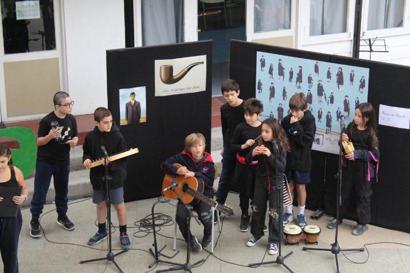 En una misma línea de trabajo, el 4ºBásico investigó la obra de René Magritte, pintor belga, para realizar una propuesta artística. Se disfrazaron de guías del Museo Magritte de Bruxelles para relevar de manera muy original aspectos importantes de la obra del pintor. Para finalizar, los estudiantes de 5ºBásico, quienes incursionaron en la música del Mali, presentaron la leyenda africana de la Kora, un instrumento de 20 o 21 cuerdas, parecida al arpa y al laúd. Este instrumento viene de países como el Burkina FasoGambiaGuineaGuinea-Bisáu y Senegal. En su proceso de aprendizaje del francés, el 5° Básico intercambió con el artista Tore Kora, músico chileno especializado en música tradicional de África, quien vino al colegio para presentar sus creaciones musicales. Esta jornada terminó con el descubrimiento de una música y sonidos encantadores.