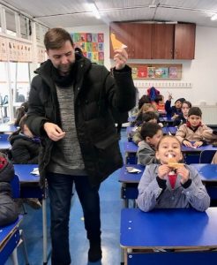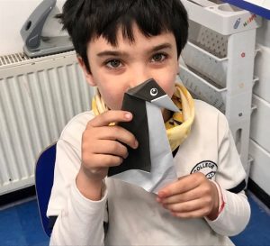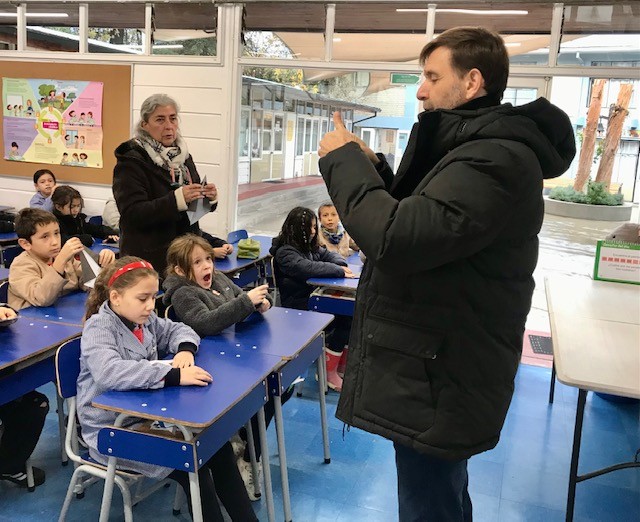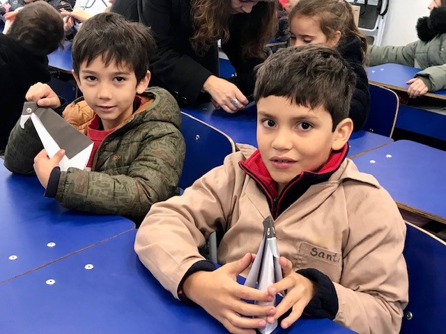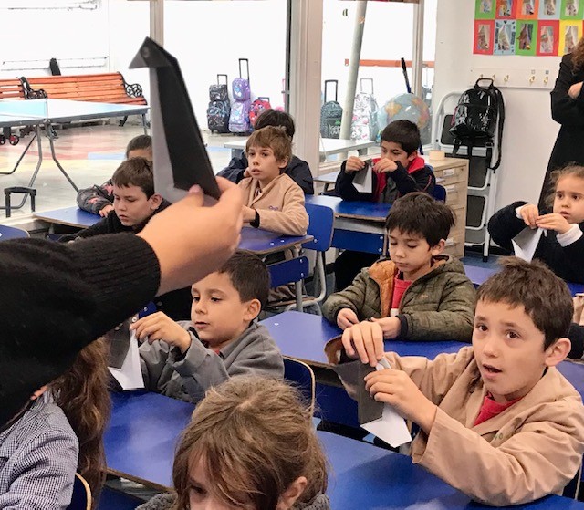 El lunes 22 de mayo Patricio Kunz, experto en plegados y autor de los libros Origami y Aves de papel, asistió a una clase de 2º básico y acompañó a los niños y las niñas en la confección de tres animales chilenos en plegado de papel.
