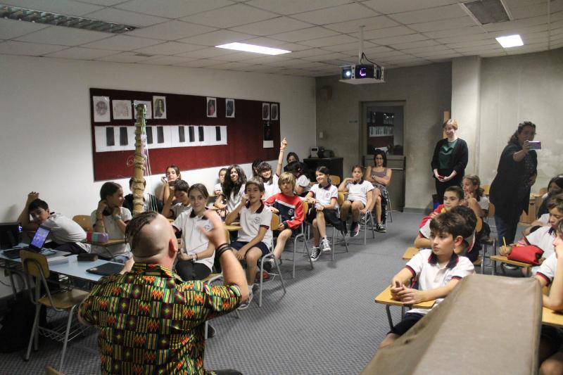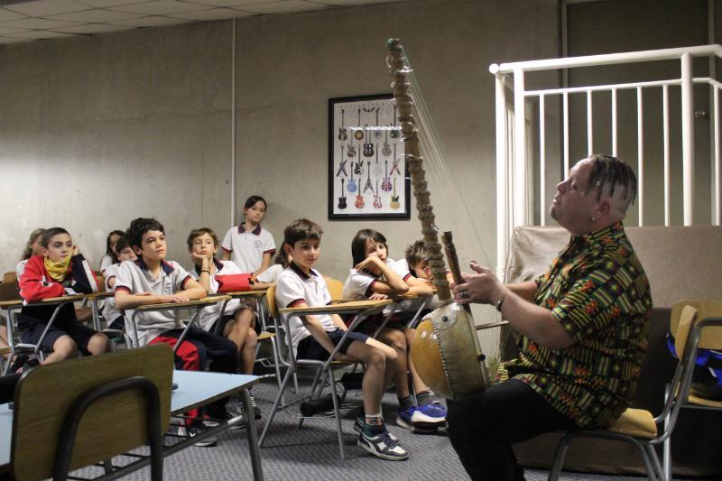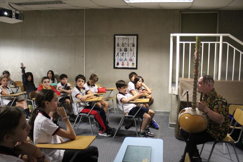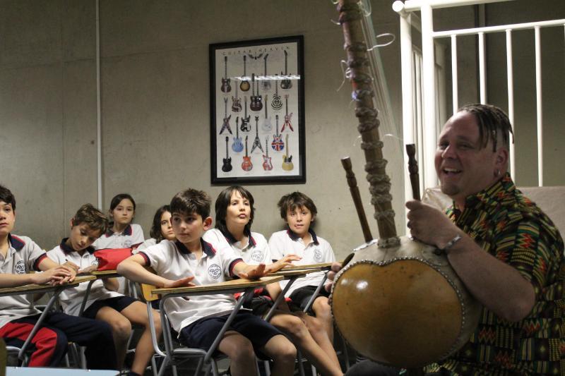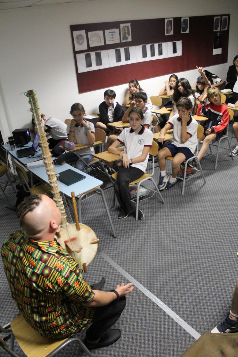 Los/as estudiantes de 5º Básico escucharon sus relatos sobre el origen de la Kora, disfrutaron de la música e invitamos a Tote a acompañarnos en el día de la francofonía para que todo el ciclo de Básica aprendiera de la música y de la cultura africana.