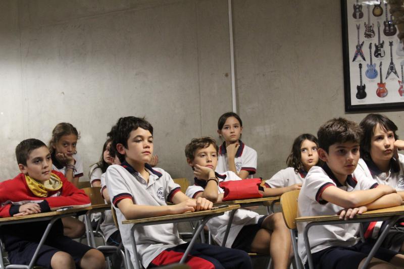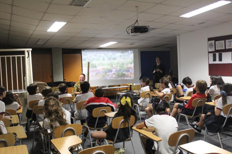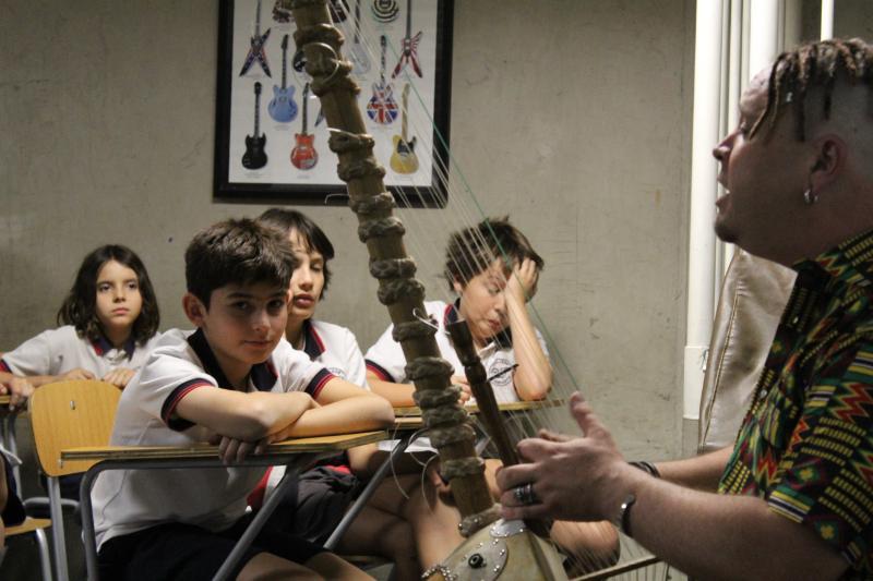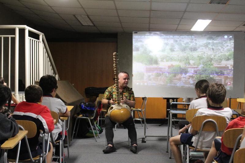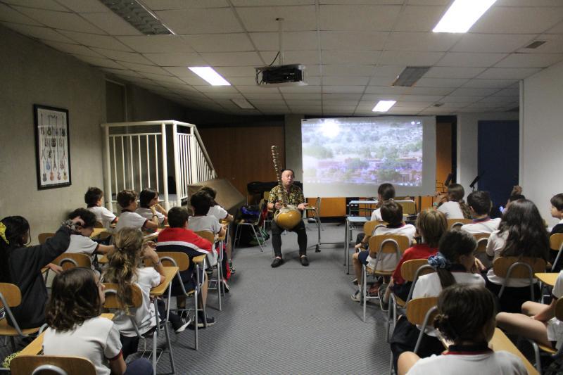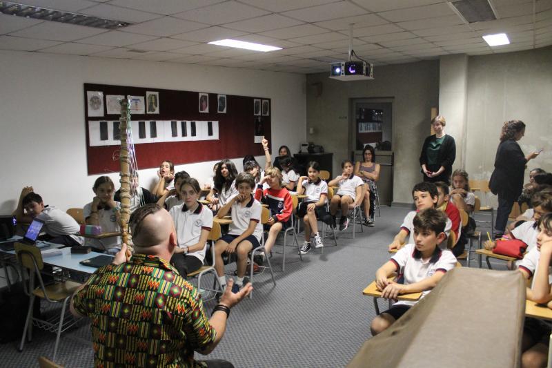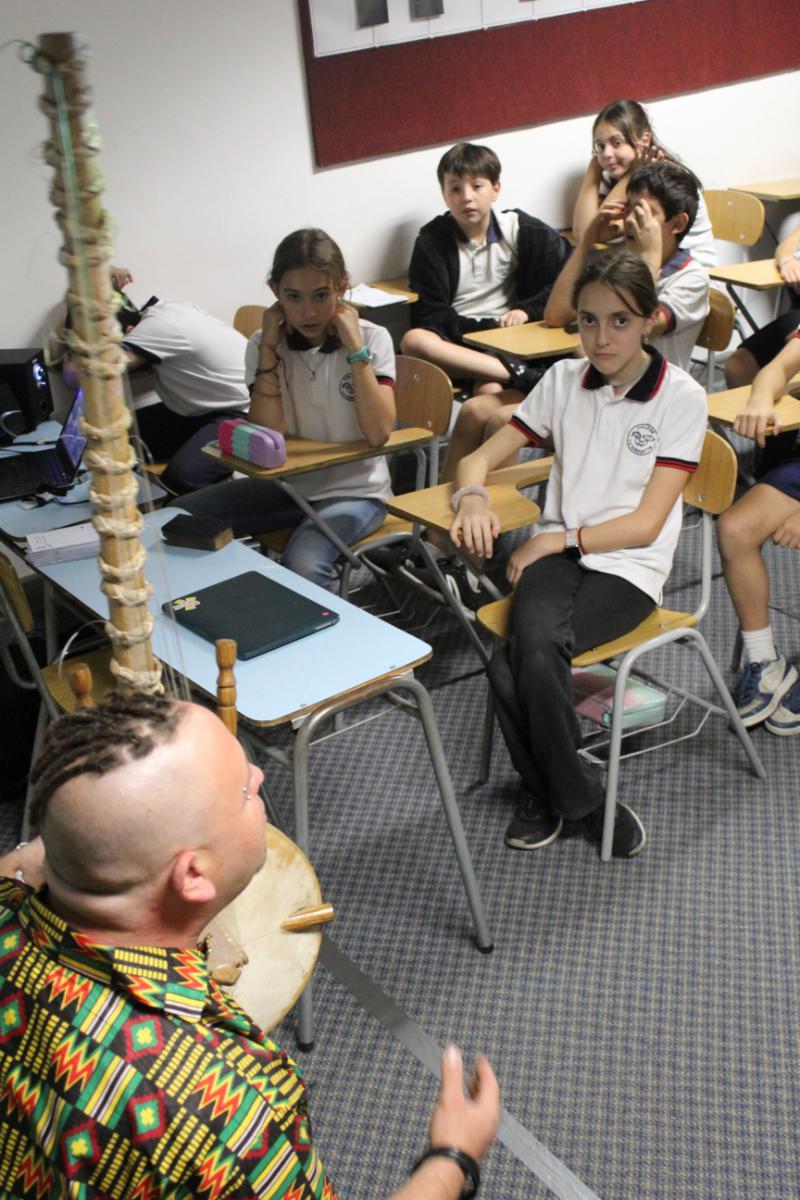 Los/as estudiantes de 5º Básico escucharon sus relatos sobre el origen de la Kora, disfrutaron de la música e invitamos a Tote a acompañarnos en el día de la francofonía para que todo el ciclo de Básica aprendiera de la música y de la cultura africana.