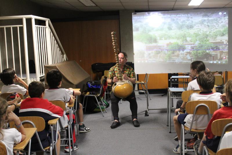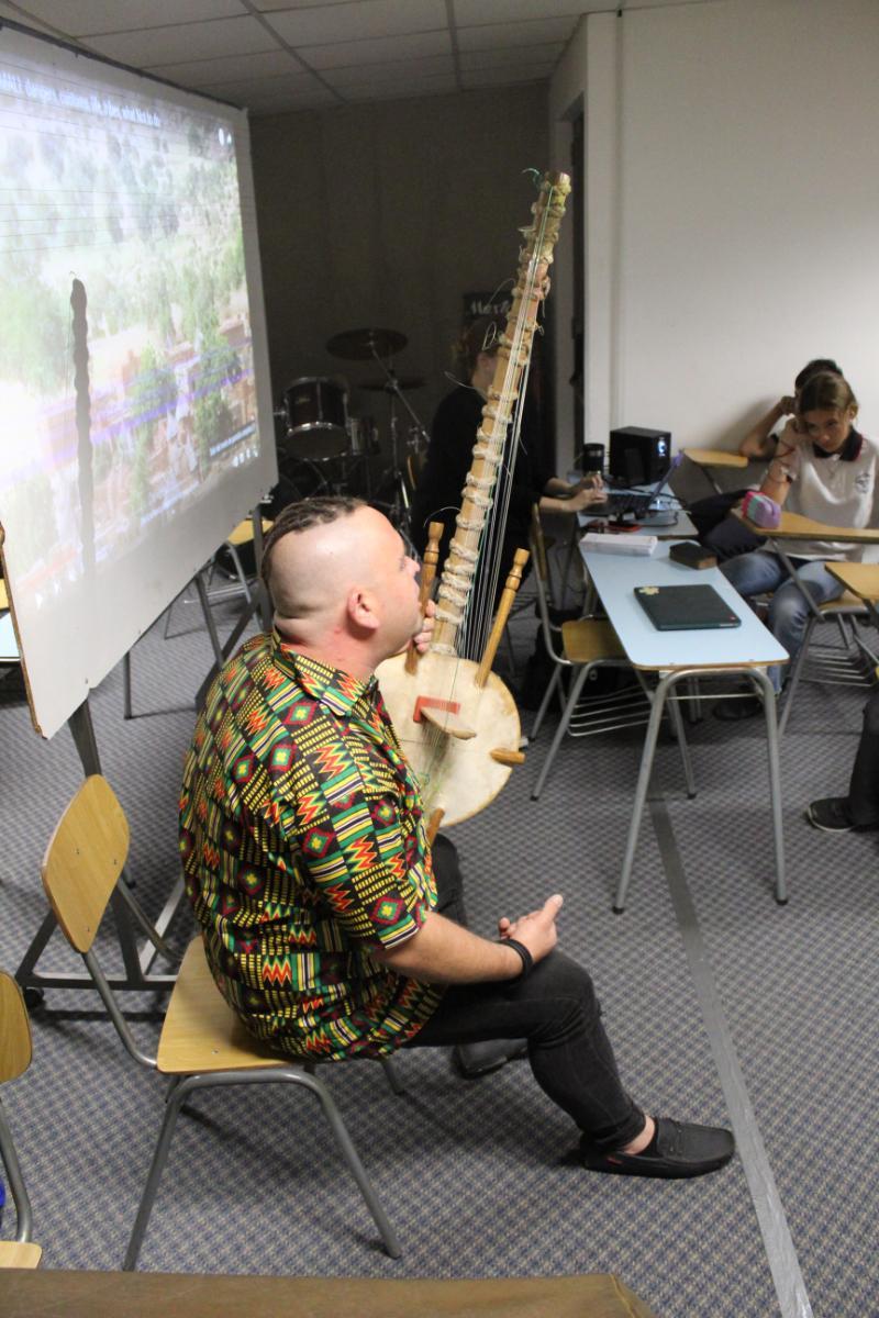 En este contexto, el viernes 5 de abril invitamos al músico, intérprete, cantante y compositor Tote Kora a un encuentro con nuestro estudiantes para que pudiera mostrar e interpretar algunas melodías con la Kora. Tote, cuyo nombre real es José, estudió música africana durante tres años en Guinea. Durante sus tres viajes a África aprendió a tocar la Kora con uno de los descendientes de la gran familia Griot. También aprendió a hablar francés y malinké, dos lenguas que unen a Guinea y Mali.